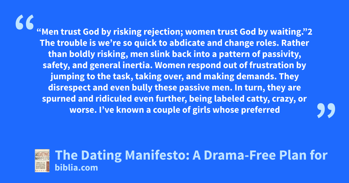 “Men trust God by risking rejection; women trust God by waiting.”2 The trouble is we’re so quick to abdicate and change roles. Rather than boldly risking, men slink back into a pattern of passivity, safety, and general inertia. Women respond out of frustration by jumping to the task, taking over, and making demands. They disrespect and even bully these passive men. In turn, they are spurned and ridiculed even further, being labeled catty, crazy, or worse. I’ve known a couple of girls whose preferred
