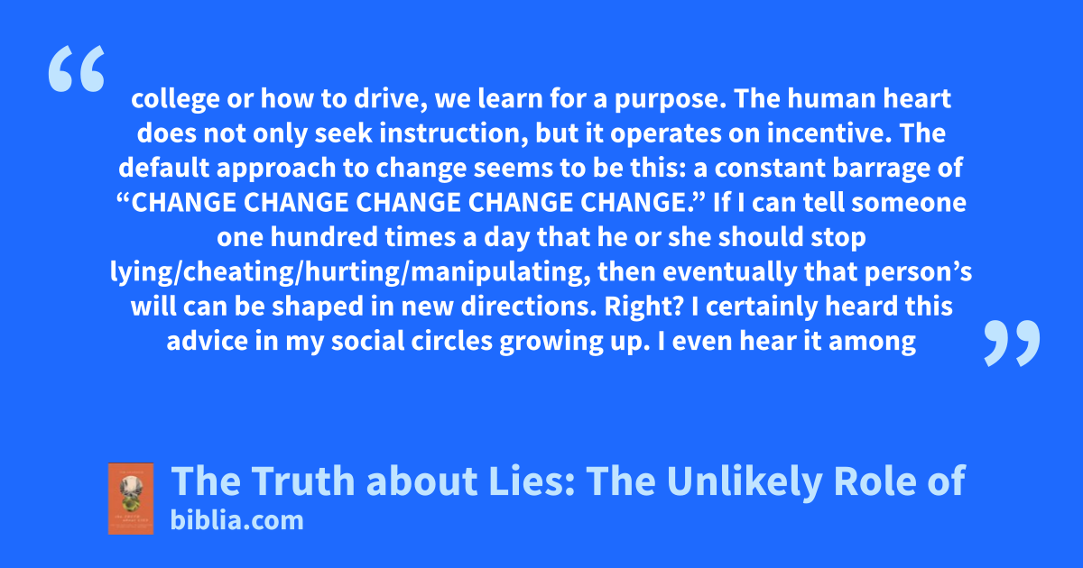 college or how to drive, we learn for a purpose. The human heart does not only seek instruction, but it operates on incentive. The default approach to change seems to be this: a constant barrage of “CHANGE CHANGE CHANGE CHANGE CHANGE.” If I can tell someone one hundred times a day that he or she should stop lying/cheating/hurting/manipulating, then eventually that person’s will can be shaped in new directions. Right? I certainly heard this advice in my social circles growing up. I even hear it among