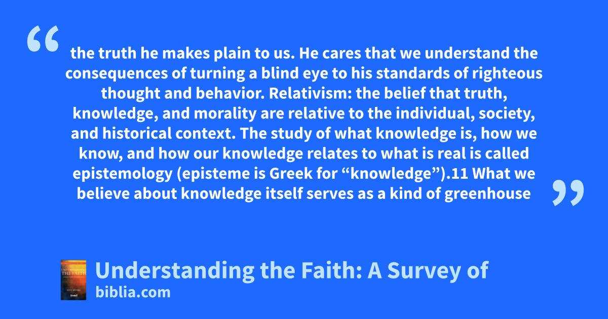 the truth he makes plain to us. He cares that we understand the consequences of turning a blind eye to his standards of righteous thought and behavior. Relativism: the belief that truth, knowledge, and morality are relative to the individual, society, and historical context. The study of what knowledge is, how we know, and how our knowledge relates to what is real is called epistemology (episteme is Greek for “knowledge”).11 What we believe about knowledge itself serves as a kind of greenhouse