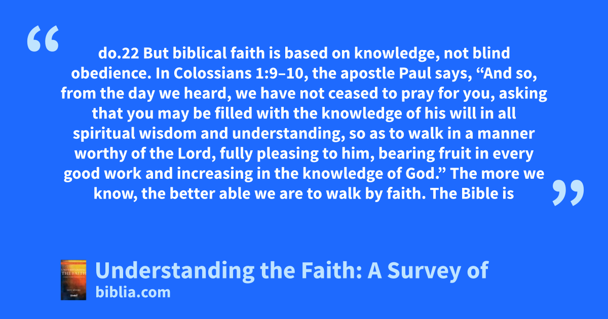 do.22 But biblical faith is based on knowledge, not blind obedience. In Colossians 1:9–10, the apostle Paul says, “And so, from the day we heard, we have not ceased to pray for you, asking that you may be filled with the knowledge of his will in all spiritual wisdom and understanding, so as to walk in a manner worthy of the Lord, fully pleasing to him, bearing fruit in every good work and increasing in the knowledge of God.” The more we know, the better able we are to walk by faith. The Bible is