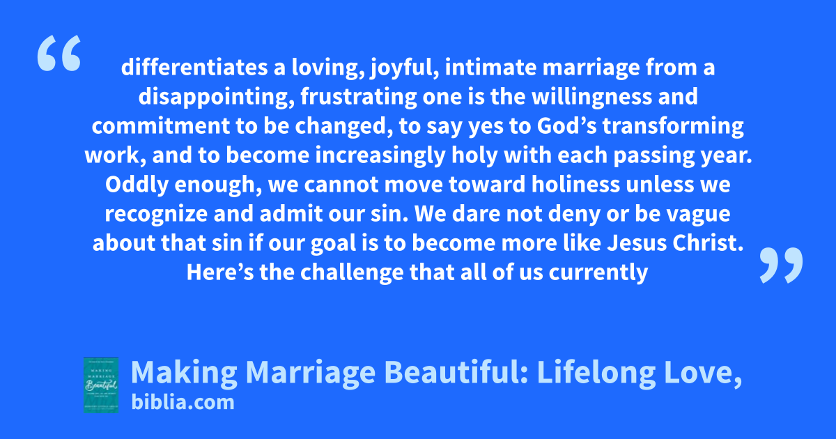 differentiates a loving, joyful, intimate marriage from a disappointing, frustrating one is the willingness and commitment to be changed, to say yes to God’s transforming work, and to become increasingly holy with each passing year. Oddly enough, we cannot move toward holiness unless we recognize and admit our sin. We dare not deny or be vague about that sin if our goal is to become more like Jesus Christ. Here’s the challenge that all of us currently