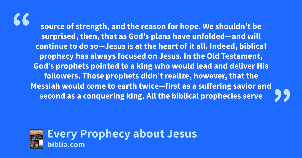 source of strength, and the reason for hope. We shouldn’t be surprised, then, that as God’s plans have unfolded—and will continue to do so—Jesus is at the heart of it all. Indeed, biblical prophecy has always focused on Jesus. In the Old Testament, God’s prophets pointed to a king who would lead and deliver His followers. Those prophets didn’t realize, however, that the Messiah would come to earth twice—first as a suffering savior and second as a conquering king. All the biblical prophecies serve