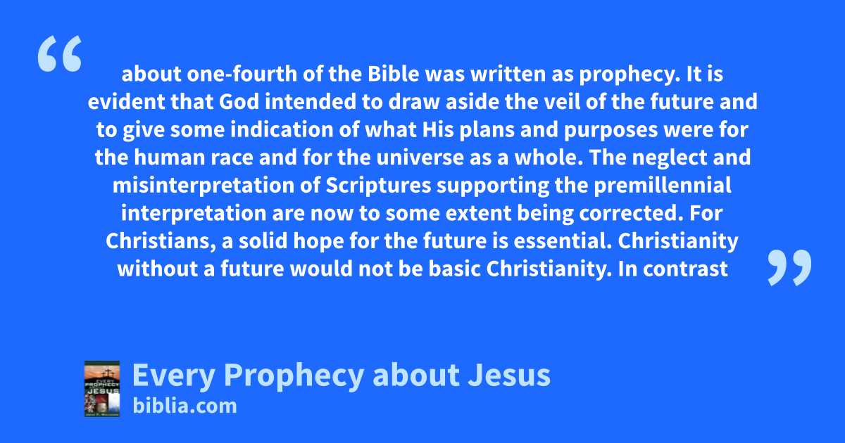 about one-fourth of the Bible was written as prophecy. It is evident that God intended to draw aside the veil of the future and to give some indication of what His plans and purposes were for the human race and for the universe as a whole. The neglect and misinterpretation of Scriptures supporting the premillennial interpretation are now to some extent being corrected. For Christians, a solid hope for the future is essential. Christianity without a future would not be basic Christianity. In contrast