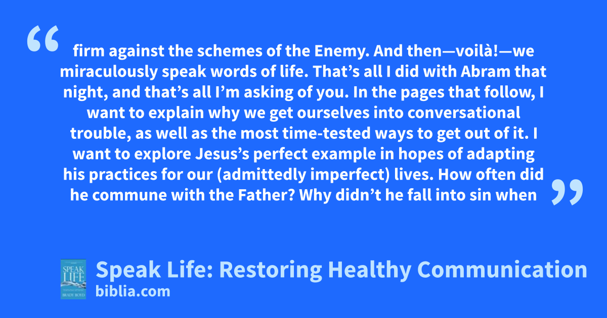 firm against the schemes of the Enemy. And then—voilà!—we miraculously speak words of life. That’s all I did with Abram that night, and that’s all I’m asking of you. In the pages that follow, I want to explain why we get ourselves into conversational trouble, as well as the most time-tested ways to get out of it. I want to explore Jesus’s perfect example in hopes of adapting his practices for our (admittedly imperfect) lives. How often did he commune with the Father? Why didn’t he fall into sin when