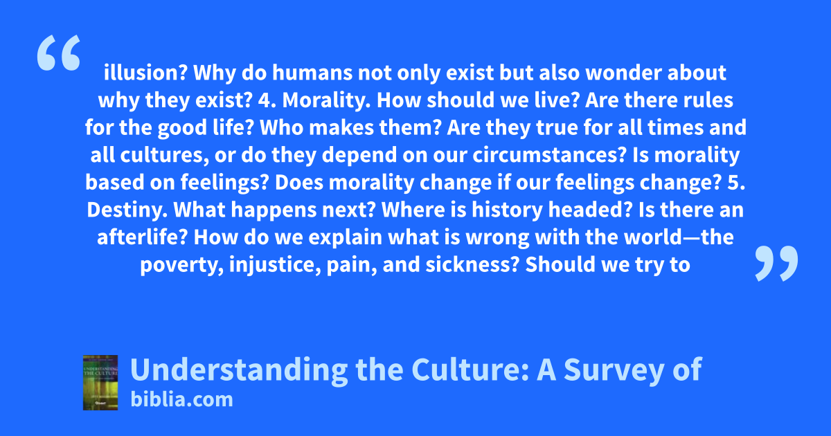 illusion? Why do humans not only exist but also wonder about why they exist? 4. Morality. How should we live? Are there rules for the good life? Who makes them? Are they true for all times and all cultures, or do they depend on our circumstances? Is morality based on feelings? Does morality change if our feelings change? 5. Destiny. What happens next? Where is history headed? Is there an afterlife? How do we explain what is wrong with the world—the poverty, injustice, pain, and sickness? Should we try to