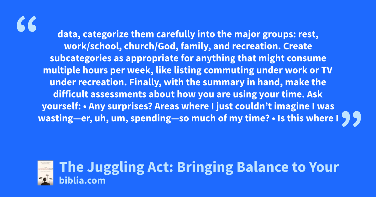 data, categorize them carefully into the major groups: rest, work/school, church/God, family, and recreation. Create subcategories as appropriate for anything that might consume multiple hours per week, like listing commuting under work or TV under recreation. Finally, with the summary in hand, make the difficult assessments about how you are using your time. Ask yourself: • Any surprises? Areas where I just couldn’t imagine I was wasting—er, uh, um, spending—so much of my time? • Is this where I