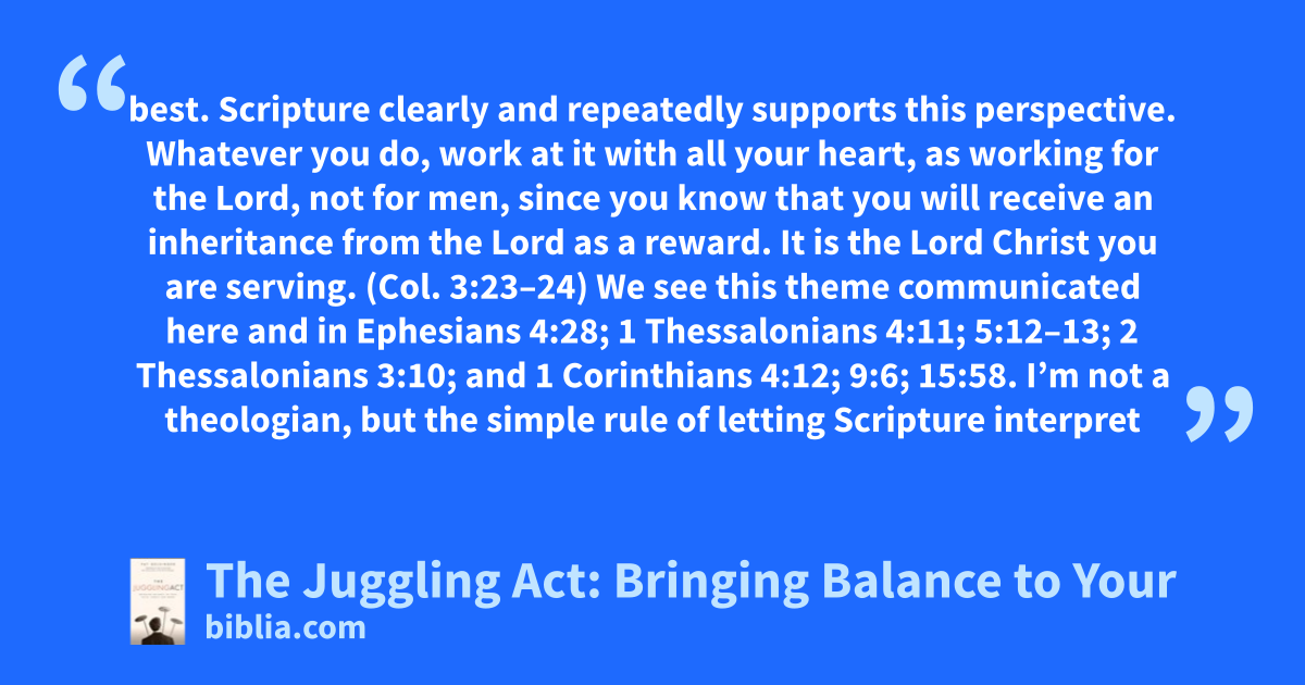 best. Scripture clearly and repeatedly supports this perspective. Whatever you do, work at it with all your heart, as working for the Lord, not for men, since you know that you will receive an inheritance from the Lord as a reward. It is the Lord Christ you are serving. (Col. 3:23–24) We see this theme communicated here and in Ephesians 4:28; 1 Thessalonians 4:11; 5:12–13; 2 Thessalonians 3:10; and 1 Corinthians 4:12; 9:6; 15:58. I’m not a theologian, but the simple rule of letting Scripture interpret