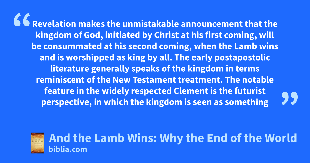 Revelation makes the unmistakable announcement that the kingdom of God, initiated by Christ at his first coming, will be consummated at his second coming, when the Lamb wins and is worshipped as king by all. The early postapostolic literature generally speaks of the kingdom in terms reminiscent of the New Testament treatment. The notable feature in the widely respected Clement is the futurist perspective, in which the kingdom is seen as something