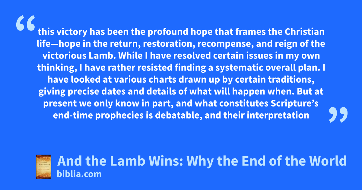 this victory has been the profound hope that frames the Christian life—hope in the return, restoration, recompense, and reign of the victorious Lamb. While I have resolved certain issues in my own thinking, I have rather resisted finding a systematic overall plan. I have looked at various charts drawn up by certain traditions, giving precise dates and details of what will happen when. But at present we only know in part, and what constitutes Scripture’s end-time prophecies is debatable, and their interpretation