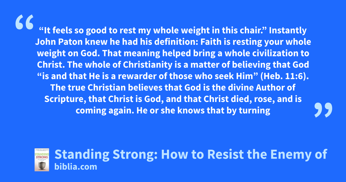 “It feels so good to rest my whole weight in this chair.” Instantly John Paton knew he had his definition: Faith is resting your whole weight on God. That meaning helped bring a whole civilization to Christ. The whole of Christianity is a matter of believing that God “is and that He is a rewarder of those who seek Him” (Heb. 11:6). The true Christian believes that God is the divine Author of Scripture, that Christ is God, and that Christ died, rose, and is coming again. He or she knows that by turning
