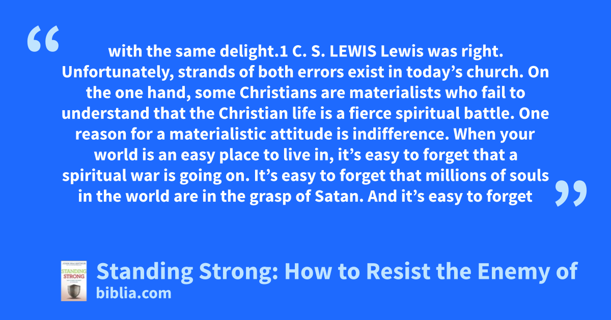 with the same delight.1 C. S. LEWIS Lewis was right. Unfortunately, strands of both errors exist in today’s church. On the one hand, some Christians are materialists who fail to understand that the Christian life is a fierce spiritual battle. One reason for a materialistic attitude is indifference. When your world is an easy place to live in, it’s easy to forget that a spiritual war is going on. It’s easy to forget that millions of souls in the world are in the grasp of Satan. And it’s easy to forget