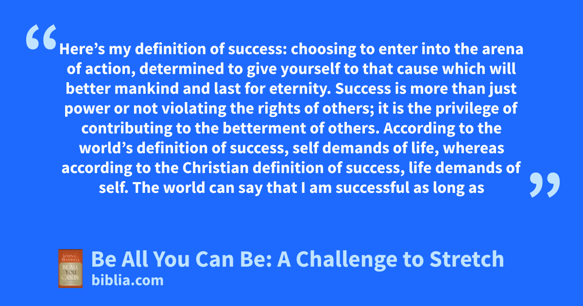 Here’s my definition of success: choosing to enter into the arena of action, determined to give yourself to that cause which will better mankind and last for eternity. Success is more than just power or not violating the rights of others; it is the privilege of contributing to the betterment of others. According to the world’s definition of success, self demands of life, whereas according to the Christian definition of success, life demands of self. The world can say that I am successful as long as