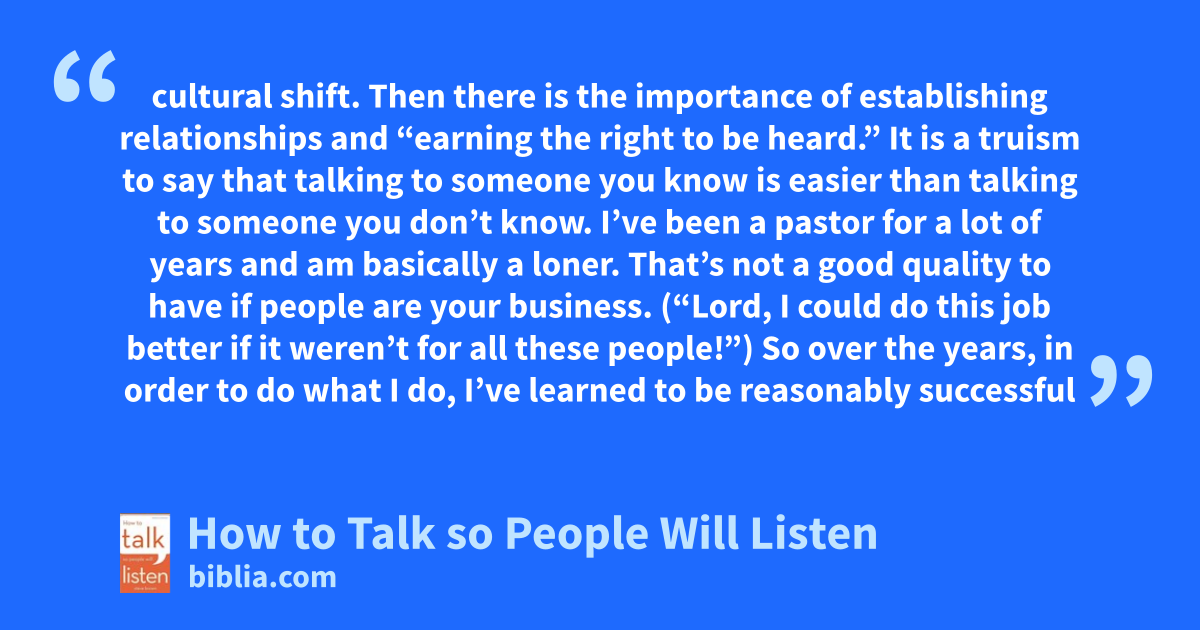 cultural shift. Then there is the importance of establishing relationships and “earning the right to be heard.” It is a truism to say that talking to someone you know is easier than talking to someone you don’t know. I’ve been a pastor for a lot of years and am basically a loner. That’s not a good quality to have if people are your business. (“Lord, I could do this job better if it weren’t for all these people!”) So over the years, in order to do what I do, I’ve learned to be reasonably successful