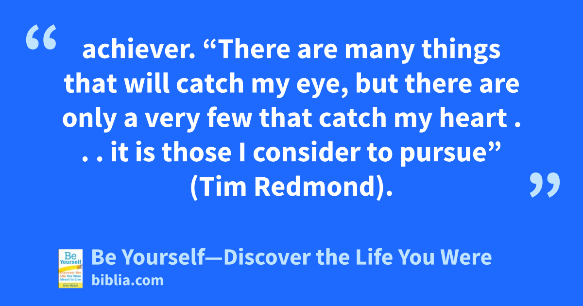 achiever. “There are many things that will catch my eye, but there are only a very few that catch my heart . . . it is those I consider to pursue” (Tim Redmond).