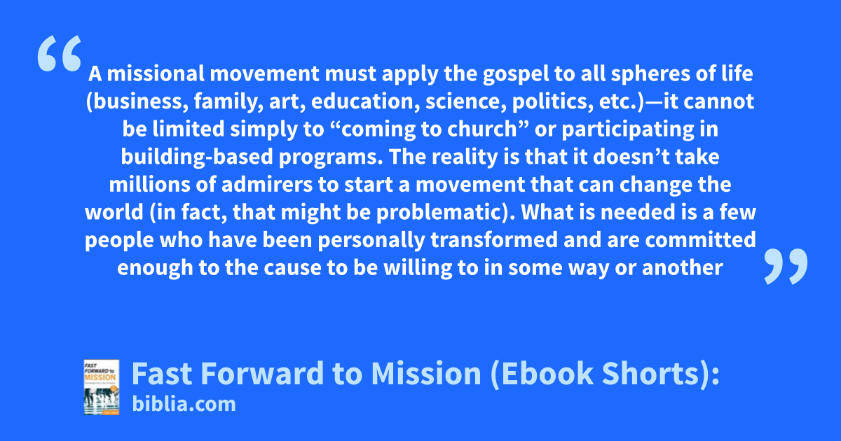 A missional movement must apply the gospel to all spheres of life (business, family, art, education, science, politics, etc.)—it cannot be limited simply to “coming to church” or participating in building-based programs. The reality is that it doesn’t take millions of admirers to start a movement that can change the world (in fact, that might be problematic). What is needed is a few people who have been personally transformed and are committed enough to the cause to be willing to in some way or another