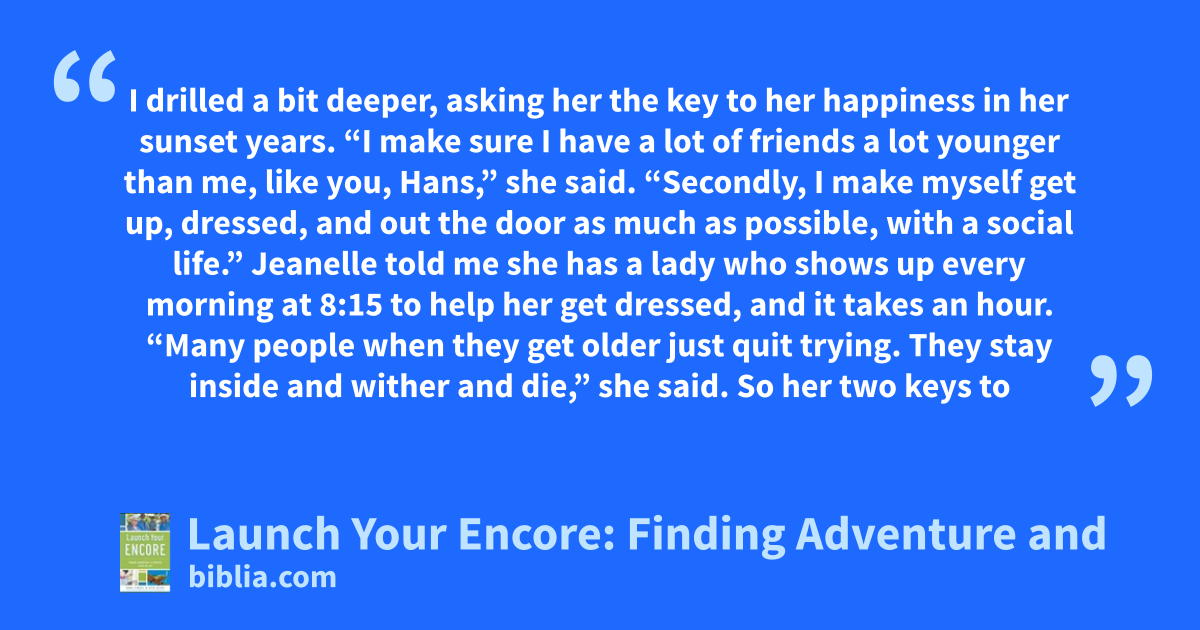 I drilled a bit deeper, asking her the key to her happiness in her sunset years. “I make sure I have a lot of friends a lot younger than me, like you, Hans,” she said. “Secondly, I make myself get up, dressed, and out the door as much as possible, with a social life.” Jeanelle told me she has a lady who shows up every morning at 8:15 to help her get dressed, and it takes an hour. “Many people when they get older just quit trying. They stay inside and wither and die,” she said. So her two keys to