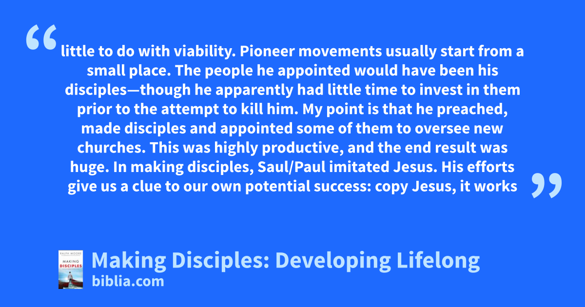 little to do with viability. Pioneer movements usually start from a small place. The people he appointed would have been his disciples—though he apparently had little time to invest in them prior to the attempt to kill him. My point is that he preached, made disciples and appointed some of them to oversee new churches. This was highly productive, and the end result was huge. In making disciples, Saul/Paul imitated Jesus. His efforts give us a clue to our own potential success: copy Jesus, it works