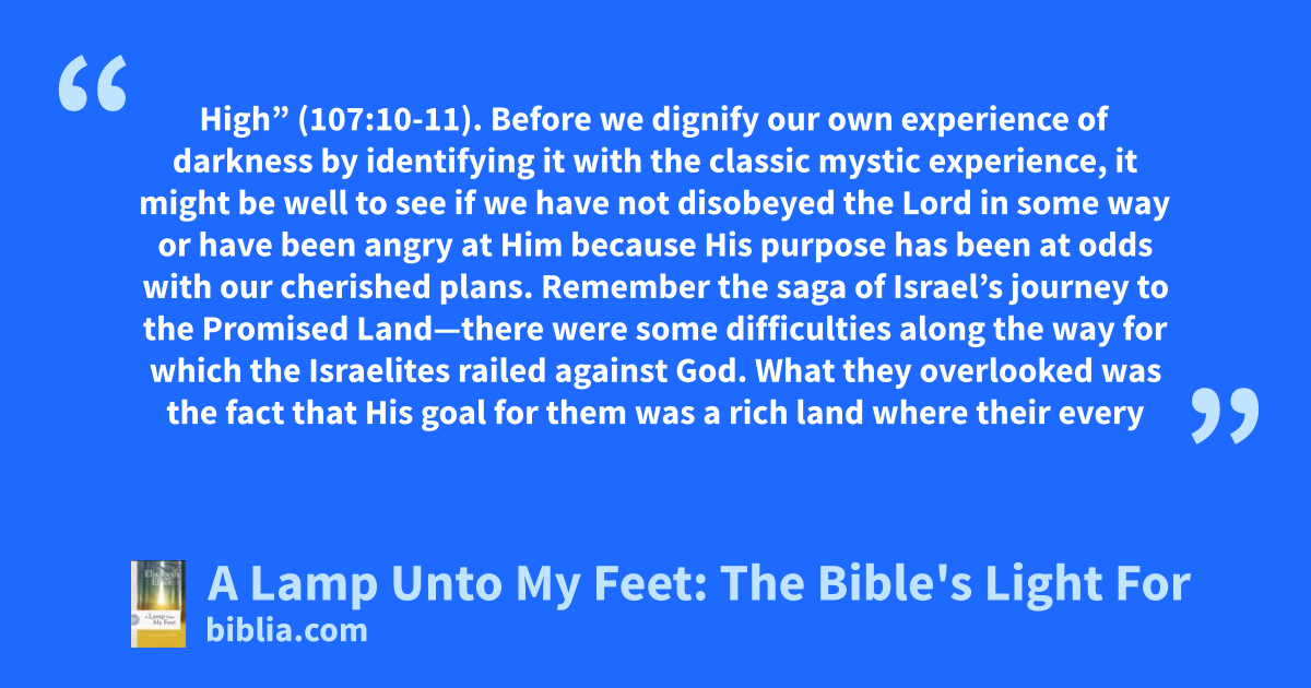 High” (107:10-11). Before we dignify our own experience of darkness by identifying it with the classic mystic experience, it might be well to see if we have not disobeyed the Lord in some way or have been angry at Him because His purpose has been at odds with our cherished plans. Remember the saga of Israel’s journey to the Promised Land—there were some difficulties along the way for which the Israelites railed against God. What they overlooked was the fact that His goal for them was a rich land where their every