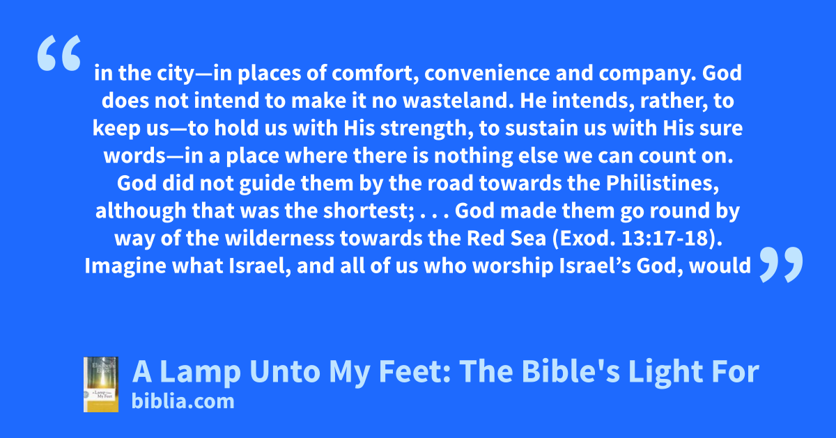 in the city—in places of comfort, convenience and company. God does not intend to make it no wasteland. He intends, rather, to keep us—to hold us with His strength, to sustain us with His sure words—in a place where there is nothing else we can count on. God did not guide them by the road towards the Philistines, although that was the shortest; . . . God made them go round by way of the wilderness towards the Red Sea (Exod. 13:17-18). Imagine what Israel, and all of us who worship Israel’s God, would