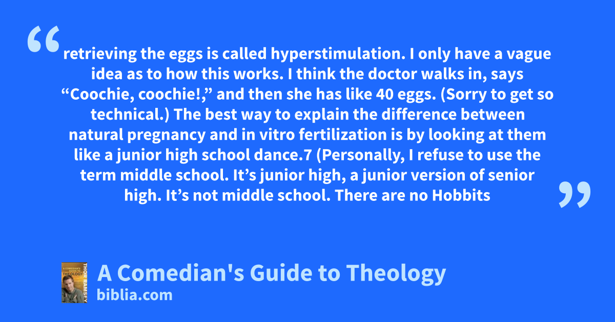 retrieving the eggs is called hyperstimulation. I only have a vague idea as to how this works. I think the doctor walks in, says “Coochie, coochie!,” and then she has like 40 eggs. (Sorry to get so technical.) The best way to explain the difference between natural pregnancy and in vitro fertilization is by looking at them like a junior high school dance.7 (Personally, I refuse to use the term middle school. It’s junior high, a junior version of senior high. It’s not middle school. There are no Hobbits