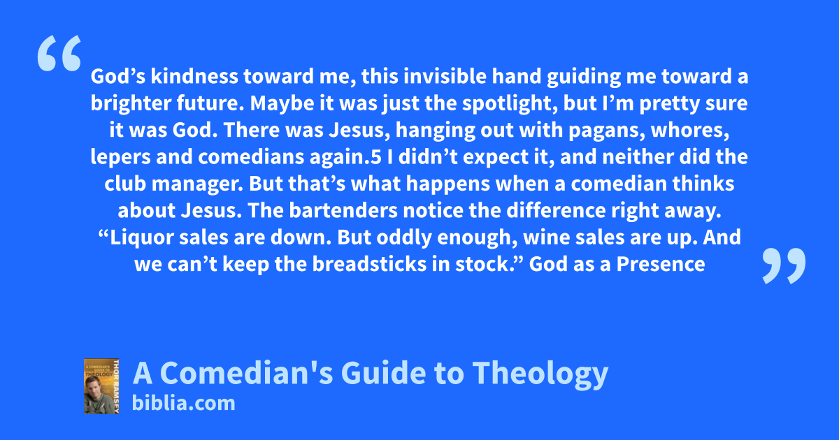 God’s kindness toward me, this invisible hand guiding me toward a brighter future. Maybe it was just the spotlight, but I’m pretty sure it was God. There was Jesus, hanging out with pagans, whores, lepers and comedians again.5 I didn’t expect it, and neither did the club manager. But that’s what happens when a comedian thinks about Jesus. The bartenders notice the difference right away. “Liquor sales are down. But oddly enough, wine sales are up. And we can’t keep the breadsticks in stock.” God as a Presence