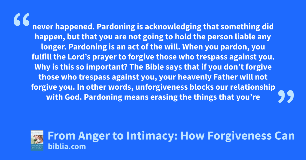never happened. Pardoning is acknowledging that something did happen, but that you are not going to hold the person liable any longer. Pardoning is an act of the will. When you pardon, you fulfill the Lord’s prayer to forgive those who trespass against you. Why is this so important? The Bible says that if you don’t forgive those who trespass against you, your heavenly Father will not forgive you. In other words, unforgiveness blocks our relationship with God. Pardoning means erasing the things that you’re