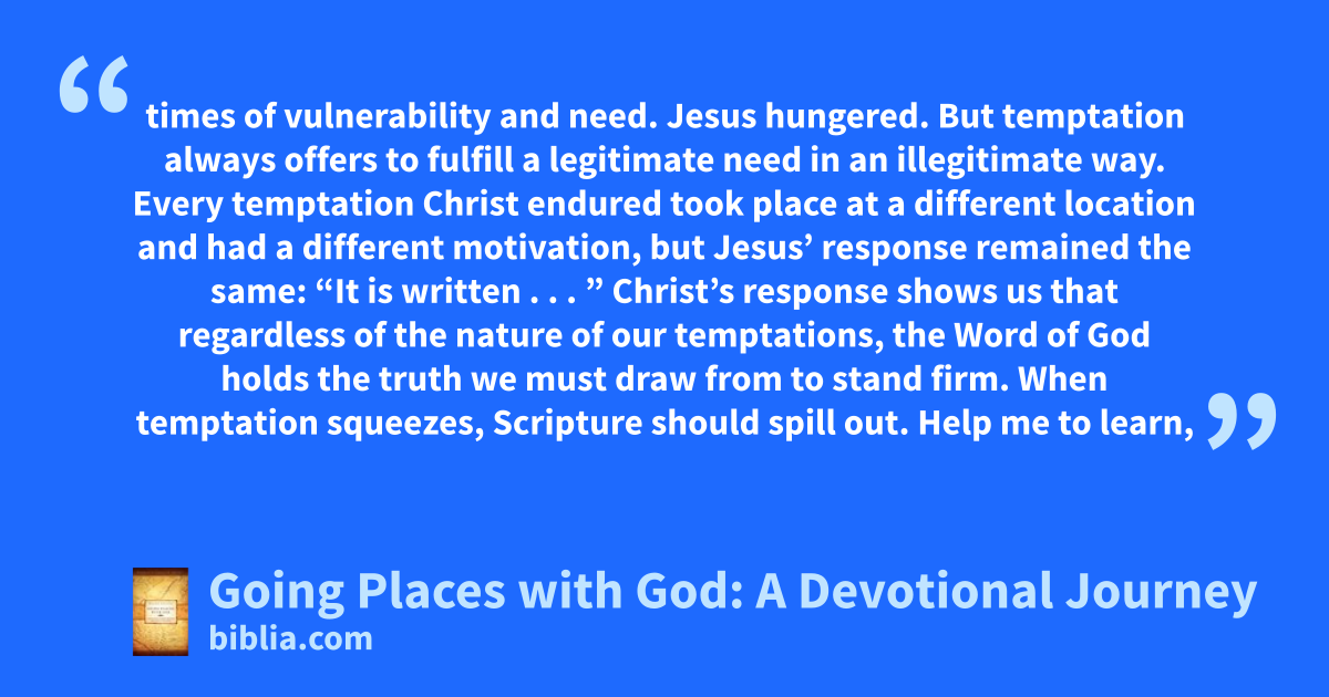 times of vulnerability and need. Jesus hungered. But temptation always offers to fulfill a legitimate need in an illegitimate way. Every temptation Christ endured took place at a different location and had a different motivation, but Jesus’ response remained the same: “It is written . . . ” Christ’s response shows us that regardless of the nature of our temptations, the Word of God holds the truth we must draw from to stand firm. When temptation squeezes, Scripture should spill out. Help me to learn,