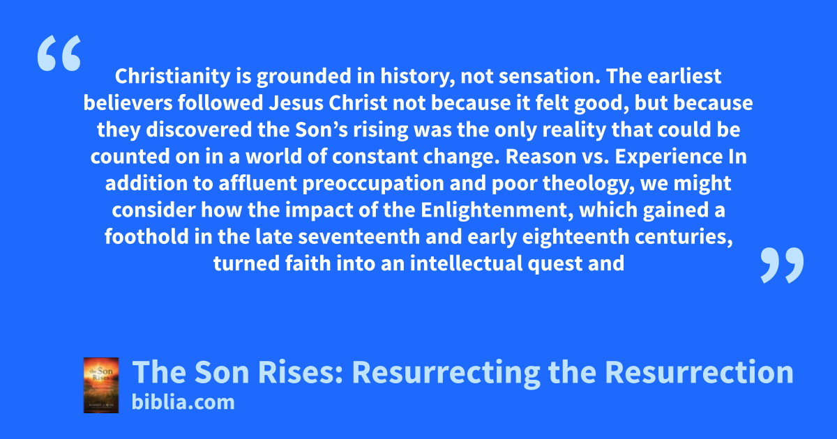 Christianity is grounded in history, not sensation. The earliest believers followed Jesus Christ not because it felt good, but because they discovered the Son’s rising was the only reality that could be counted on in a world of constant change. Reason vs. Experience In addition to affluent preoccupation and poor theology, we might consider how the impact of the Enlightenment, which gained a foothold in the late seventeenth and early eighteenth centuries, turned faith into an intellectual quest and