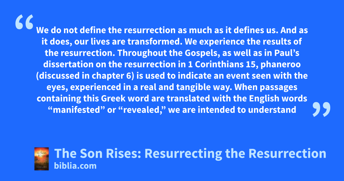 We do not define the resurrection as much as it defines us. And as it does, our lives are transformed. We experience the results of the resurrection. Throughout the Gospels, as well as in Paul’s dissertation on the resurrection in 1 Corinthians 15, phaneroo (discussed in chapter 6) is used to indicate an event seen with the eyes, experienced in a real and tangible way. When passages containing this Greek word are translated with the English words “manifested” or “revealed,” we are intended to understand
