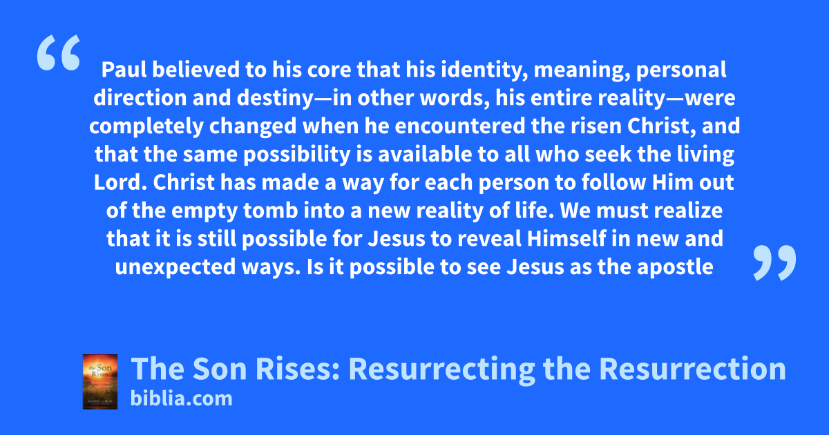 Paul believed to his core that his identity, meaning, personal direction and destiny—in other words, his entire reality—were completely changed when he encountered the risen Christ, and that the same possibility is available to all who seek the living Lord. Christ has made a way for each person to follow Him out of the empty tomb into a new reality of life. We must realize that it is still possible for Jesus to reveal Himself in new and unexpected ways. Is it possible to see Jesus as the apostle