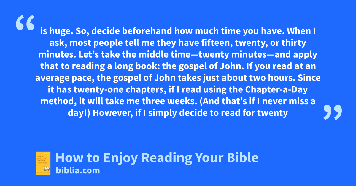 is huge. So, decide beforehand how much time you have. When I ask, most people tell me they have fifteen, twenty, or thirty minutes. Let’s take the middle time—twenty minutes—and apply that to reading a long book: the gospel of John. If you read at an average pace, the gospel of John takes just about two hours. Since it has twenty-one chapters, if I read using the Chapter-a-Day method, it will take me three weeks. (And that’s if I never miss a day!) However, if I simply decide to read for twenty