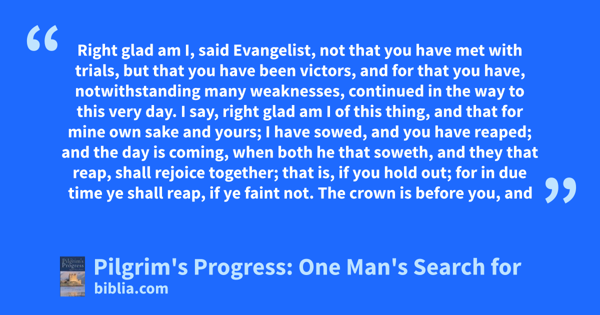 Right glad am I, said Evangelist, not that you have met with trials, but that you have been victors, and for that you have, notwithstanding many weaknesses, continued in the way to this very day. I say, right glad am I of this thing, and that for mine own sake and yours; I have sowed, and you have reaped; and the day is coming, when both he that soweth, and they that reap, shall rejoice together; that is, if you hold out; for in due time ye shall reap, if ye faint not. The crown is before you, and