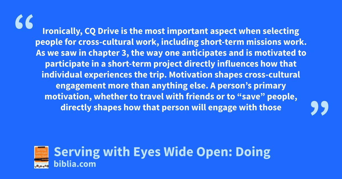 Ironically, CQ Drive is the most important aspect when selecting people for cross-cultural work, including short-term missions work. As we saw in chapter 3, the way one anticipates and is motivated to participate in a short-term project directly influences how that individual experiences the trip. Motivation shapes cross-cultural engagement more than anything else. A person’s primary motivation, whether to travel with friends or to “save” people, directly shapes how that person will engage with those