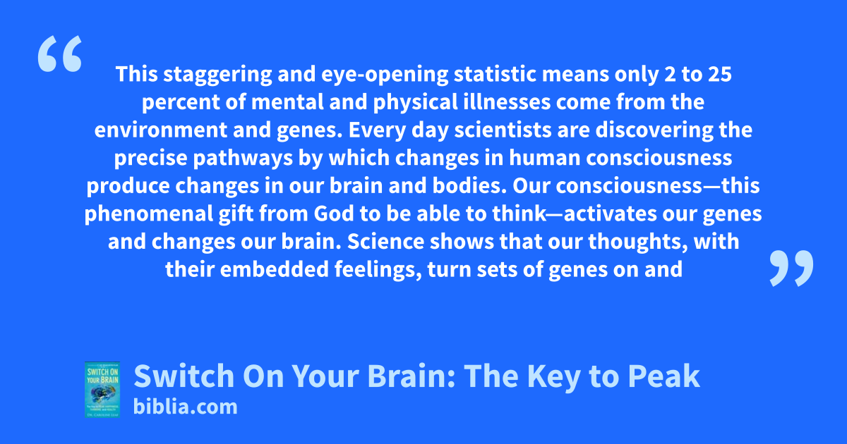 This staggering and eye-opening statistic means only 2 to 25 percent of mental and physical illnesses come from the environment and genes. Every day scientists are discovering the precise pathways by which changes in human consciousness produce changes in our brain and bodies. Our consciousness—this phenomenal gift from God to be able to think—activates our genes and changes our brain. Science shows that our thoughts, with their embedded feelings, turn sets of genes on and