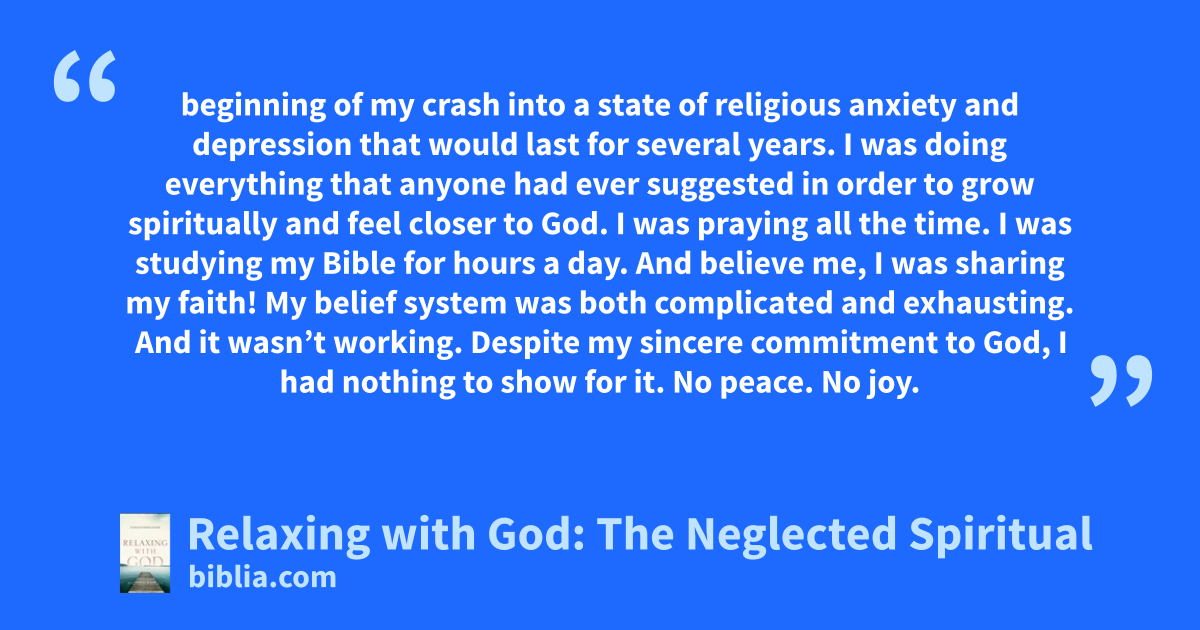 beginning of my crash into a state of religious anxiety and depression that would last for several years. I was doing everything that anyone had ever suggested in order to grow spiritually and feel closer to God. I was praying all the time. I was studying my Bible for hours a day. And believe me, I was sharing my faith! My belief system was both complicated and exhausting. And it wasn’t working. Despite my sincere commitment to God, I had nothing to show for it. No peace. No joy.