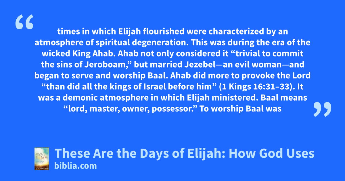 times in which Elijah flourished were characterized by an atmosphere of spiritual degeneration. This was during the era of the wicked King Ahab. Ahab not only considered it “trivial to commit the sins of Jeroboam,” but married Jezebel—an evil woman—and began to serve and worship Baal. Ahab did more to provoke the Lord “than did all the kings of Israel before him” (1 Kings 16:31–33). It was a demonic atmosphere in which Elijah ministered. Baal means “lord, master, owner, possessor.” To worship Baal was