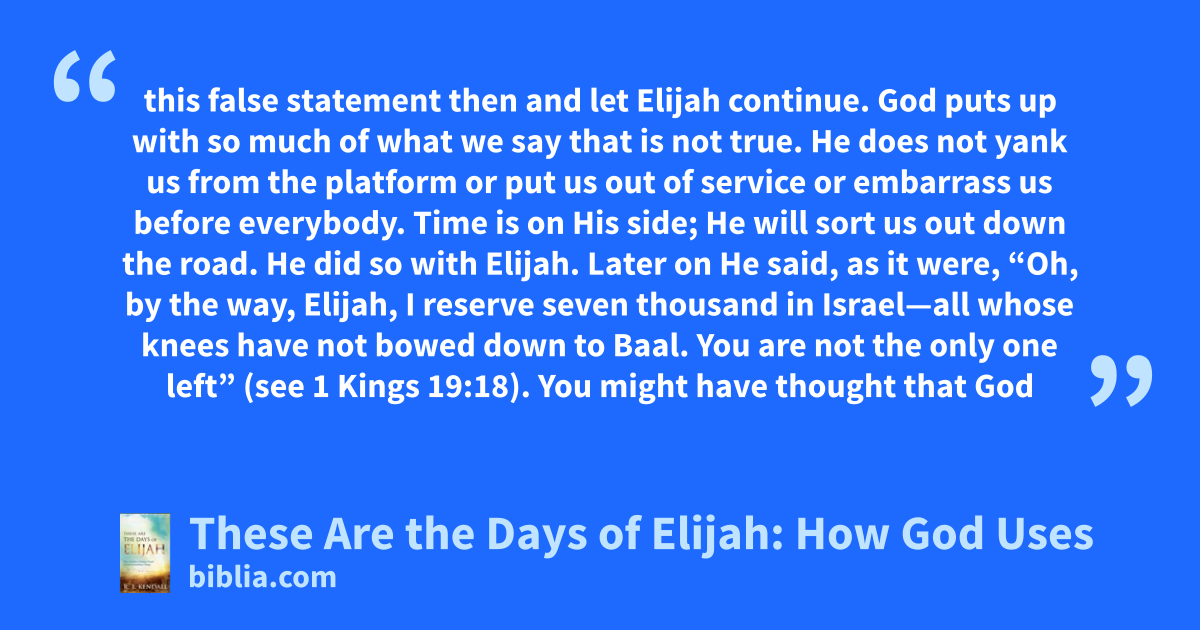 this false statement then and let Elijah continue. God puts up with so much of what we say that is not true. He does not yank us from the platform or put us out of service or embarrass us before everybody. Time is on His side; He will sort us out down the road. He did so with Elijah. Later on He said, as it were, “Oh, by the way, Elijah, I reserve seven thousand in Israel—all whose knees have not bowed down to Baal. You are not the only one left” (see 1 Kings 19:18). You might have thought that God