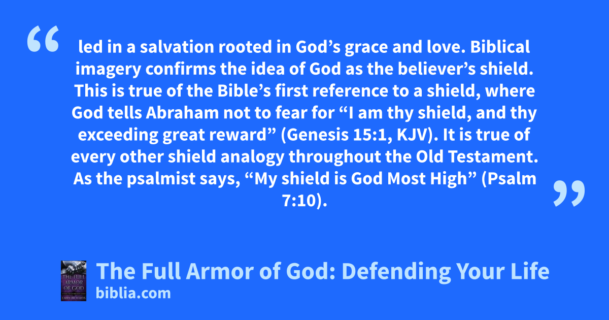 led in a salvation rooted in God’s grace and love. Biblical imagery confirms the idea of God as the believer’s shield. This is true of the Bible’s first reference to a shield, where God tells Abraham not to fear for “I am thy shield, and thy exceeding great reward” (Genesis 15:1, KJV). It is true of every other shield analogy throughout the Old Testament. As the psalmist says, “My shield is God Most High” (Psalm 7:10).