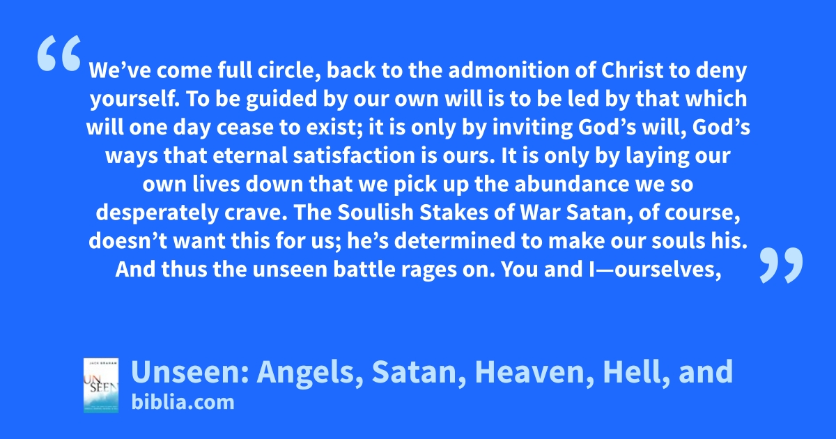 We’ve come full circle, back to the admonition of Christ to deny yourself. To be guided by our own will is to be led by that which will one day cease to exist; it is only by inviting God’s will, God’s ways that eternal satisfaction is ours. It is only by laying our own lives down that we pick up the abundance we so desperately crave. The Soulish Stakes of War Satan, of course, doesn’t want this for us; he’s determined to make our souls his. And thus the unseen battle rages on. You and I—ourselves,