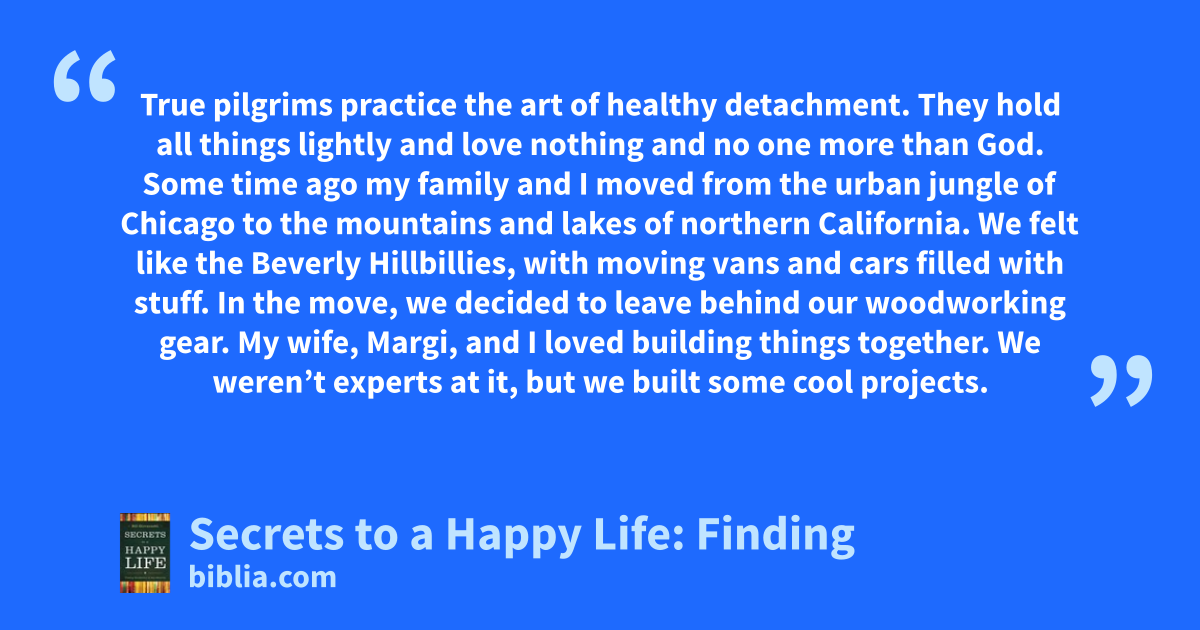 True pilgrims practice the art of healthy detachment. They hold all things lightly and love nothing and no one more than God. Some time ago my family and I moved from the urban jungle of Chicago to the mountains and lakes of northern California. We felt like the Beverly Hillbillies, with moving vans and cars filled with stuff. In the move, we decided to leave behind our woodworking gear. My wife, Margi, and I loved building things together. We weren’t experts at it, but we built some cool projects.