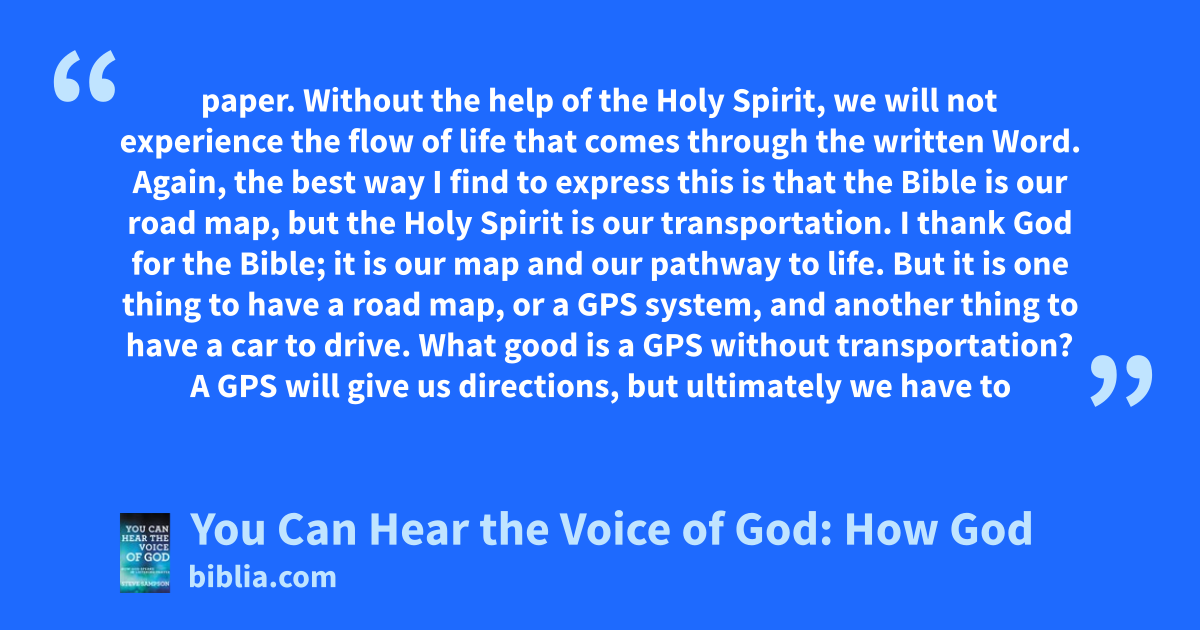 paper. Without the help of the Holy Spirit, we will not experience the flow of life that comes through the written Word. Again, the best way I find to express this is that the Bible is our road map, but the Holy Spirit is our transportation. I thank God for the Bible; it is our map and our pathway to life. But it is one thing to have a road map, or a GPS system, and another thing to have a car to drive. What good is a GPS without transportation? A GPS will give us directions, but ultimately we have to