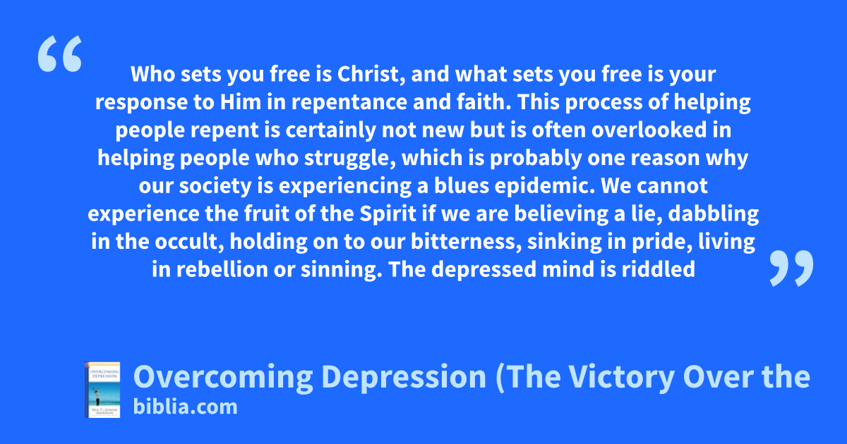 Who sets you free is Christ, and what sets you free is your response to Him in repentance and faith. This process of helping people repent is certainly not new but is often overlooked in helping people who struggle, which is probably one reason why our society is experiencing a blues epidemic. We cannot experience the fruit of the Spirit if we are believing a lie, dabbling in the occult, holding on to our bitterness, sinking in pride, living in rebellion or sinning. The depressed mind is riddled