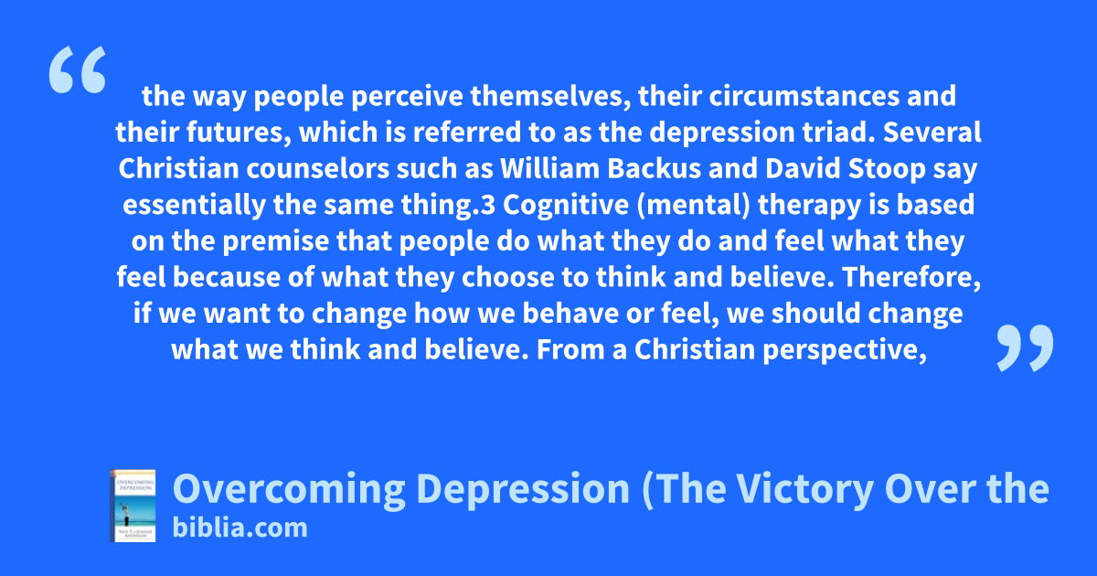 the way people perceive themselves, their circumstances and their futures, which is referred to as the depression triad. Several Christian counselors such as William Backus and David Stoop say essentially the same thing.3 Cognitive (mental) therapy is based on the premise that people do what they do and feel what they feel because of what they choose to think and believe. Therefore, if we want to change how we behave or feel, we should change what we think and believe. From a Christian perspective,