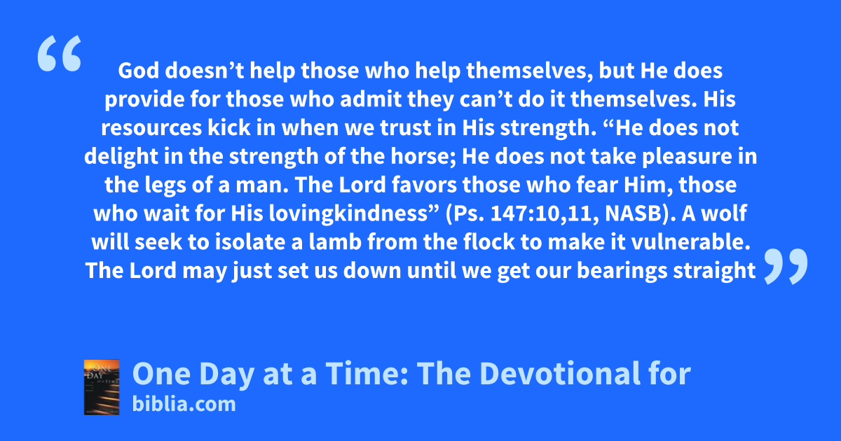 God doesn’t help those who help themselves, but He does provide for those who admit they can’t do it themselves. His resources kick in when we trust in His strength. “He does not delight in the strength of the horse; He does not take pleasure in the legs of a man. The Lord favors those who fear Him, those who wait for His lovingkindness” (Ps. 147:10,11, NASB). A wolf will seek to isolate a lamb from the flock to make it vulnerable. The Lord may just set us down until we get our bearings straight