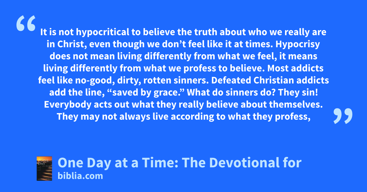 It is not hypocritical to believe the truth about who we really are in Christ, even though we don’t feel like it at times. Hypocrisy does not mean living differently from what we feel, it means living differently from what we profess to believe. Most addicts feel like no-good, dirty, rotten sinners. Defeated Christian addicts add the line, “saved by grace.” What do sinners do? They sin! Everybody acts out what they really believe about themselves. They may not always live according to what they profess,