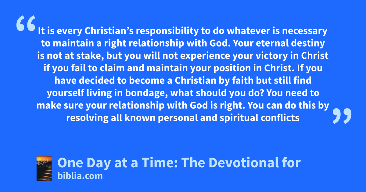 It is every Christian’s responsibility to do whatever is necessary to maintain a right relationship with God. Your eternal destiny is not at stake, but you will not experience your victory in Christ if you fail to claim and maintain your position in Christ. If you have decided to become a Christian by faith but still find yourself living in bondage, what should you do? You need to make sure your relationship with God is right. You can do this by resolving all known personal and spiritual conflicts