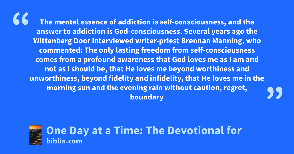 The mental essence of addiction is self-consciousness, and the answer to addiction is God-consciousness. Several years ago the Wittenberg Door interviewed writer-priest Brennan Manning, who commented: The only lasting freedom from self-consciousness comes from a profound awareness that God loves me as I am and not as I should be, that He loves me beyond worthiness and unworthiness, beyond fidelity and infidelity, that He loves me in the morning sun and the evening rain without caution, regret, boundary