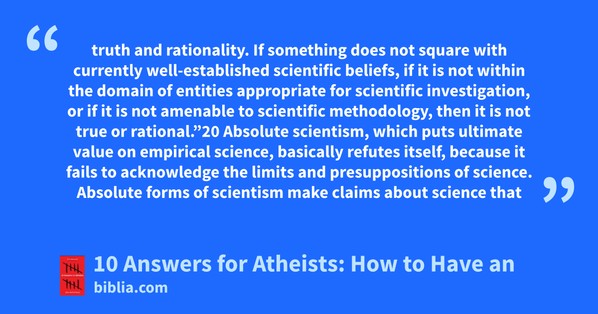 truth and rationality. If something does not square with currently well-established scientific beliefs, if it is not within the domain of entities appropriate for scientific investigation, or if it is not amenable to scientific methodology, then it is not true or rational.”20 Absolute scientism, which puts ultimate value on empirical science, basically refutes itself, because it fails to acknowledge the limits and presuppositions of science. Absolute forms of scientism make claims about science that
