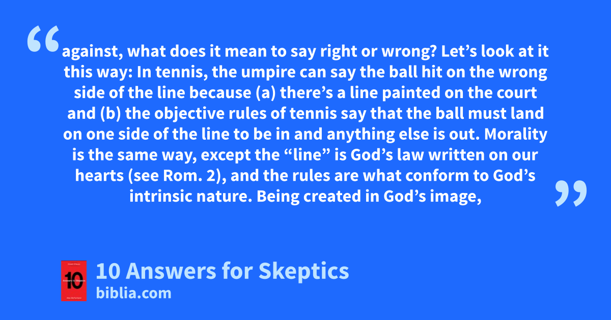 against, what does it mean to say right or wrong? Let’s look at it this way: In tennis, the umpire can say the ball hit on the wrong side of the line because (a) there’s a line painted on the court and (b) the objective rules of tennis say that the ball must land on one side of the line to be in and anything else is out. Morality is the same way, except the “line” is God’s law written on our hearts (see Rom. 2), and the rules are what conform to God’s intrinsic nature. Being created in God’s image,
