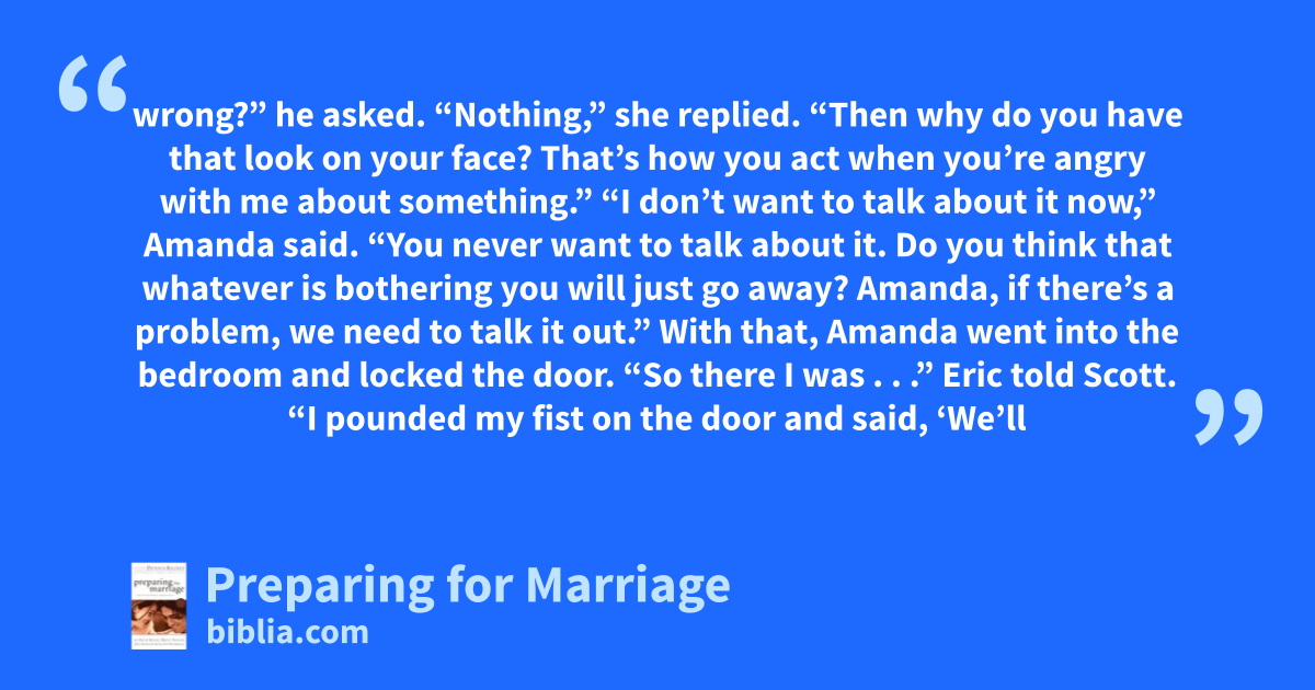 wrong?” he asked. “Nothing,” she replied. “Then why do you have that look on your face? That’s how you act when you’re angry with me about something.” “I don’t want to talk about it now,” Amanda said. “You never want to talk about it. Do you think that whatever is bothering you will just go away? Amanda, if there’s a problem, we need to talk it out.” With that, Amanda went into the bedroom and locked the door. “So there I was . . .” Eric told Scott. “I pounded my fist on the door and said, ‘We’ll